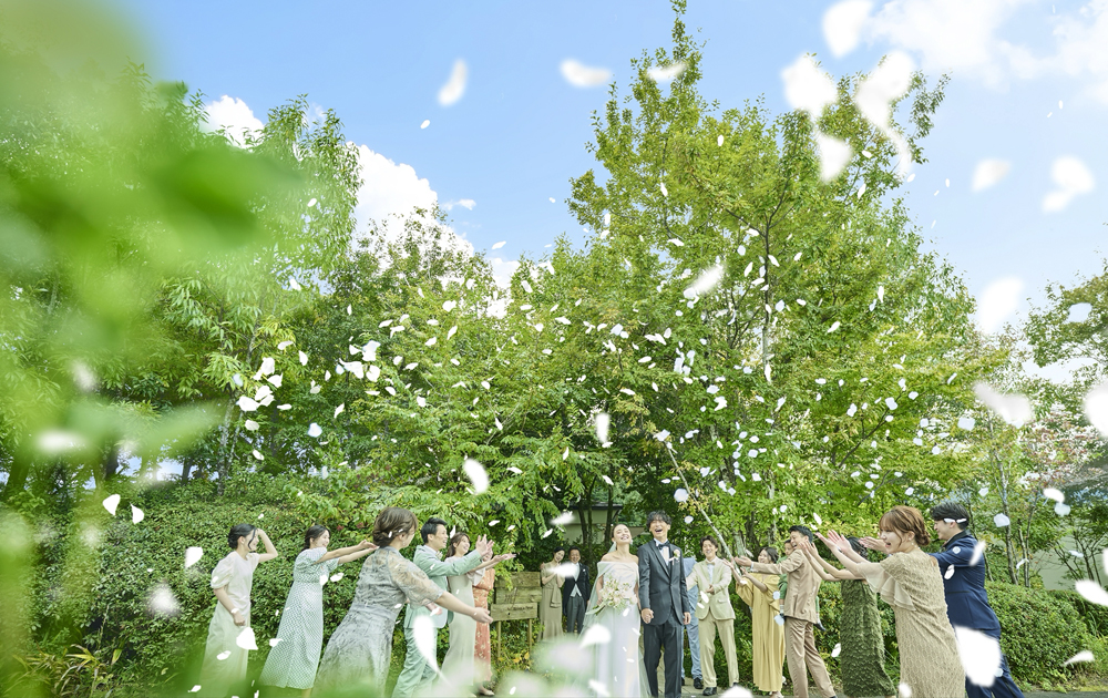 式場は緑に囲まれ暖かく印象に残る空間でした。その場所に足を踏み入れた瞬間、周囲の世界が一変したような気がしました。目の前に広がるのは、雰囲気によく合った色の葉や草花、そして太陽の光が透過して優しく差し込む場所。